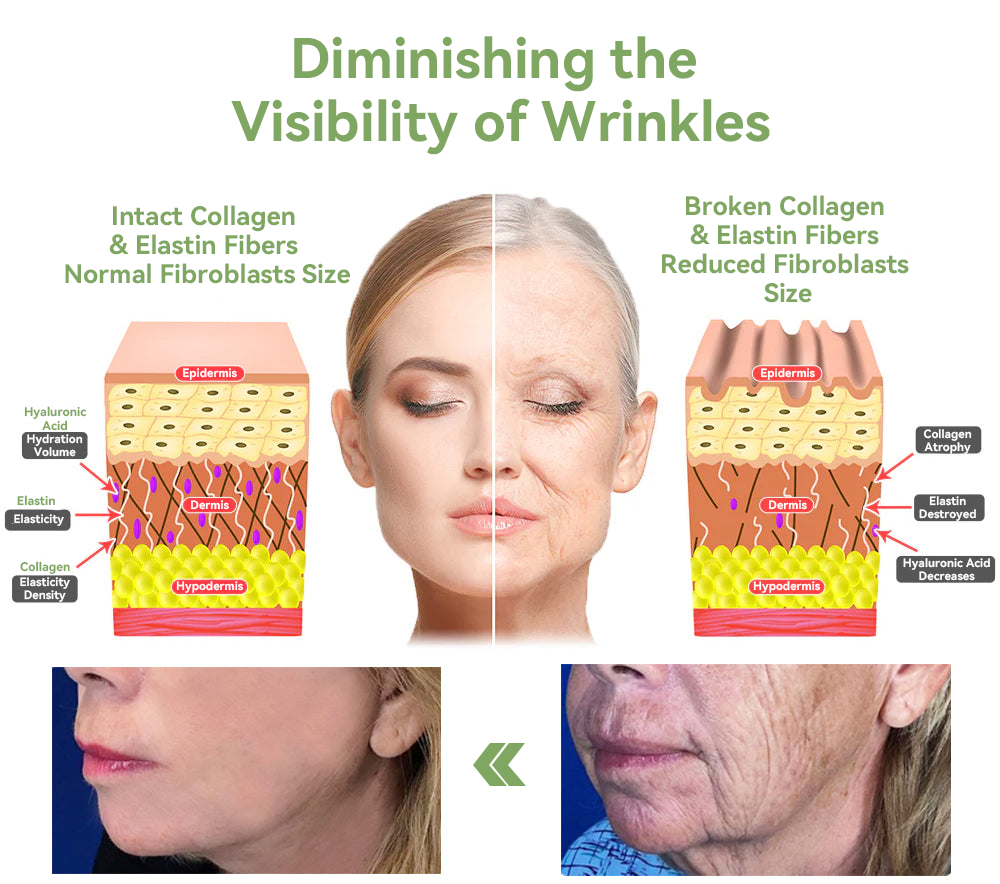 As people get older, their bodies experience the normal effects of aging. This development usually begins in their early twenties, as the production of collagen, which contributes to skin structure, slows down and the elasticity of elastin, responsible for skin resilience, reduces or deteriorates. These effects are particularly noticeable in women. Furthermore, the shedding of dead skin cells may become more sluggish, while the creation of new skin cells may gradually decrease, resulting in the formation of sagging and wrinkles across the body's skin tissue.